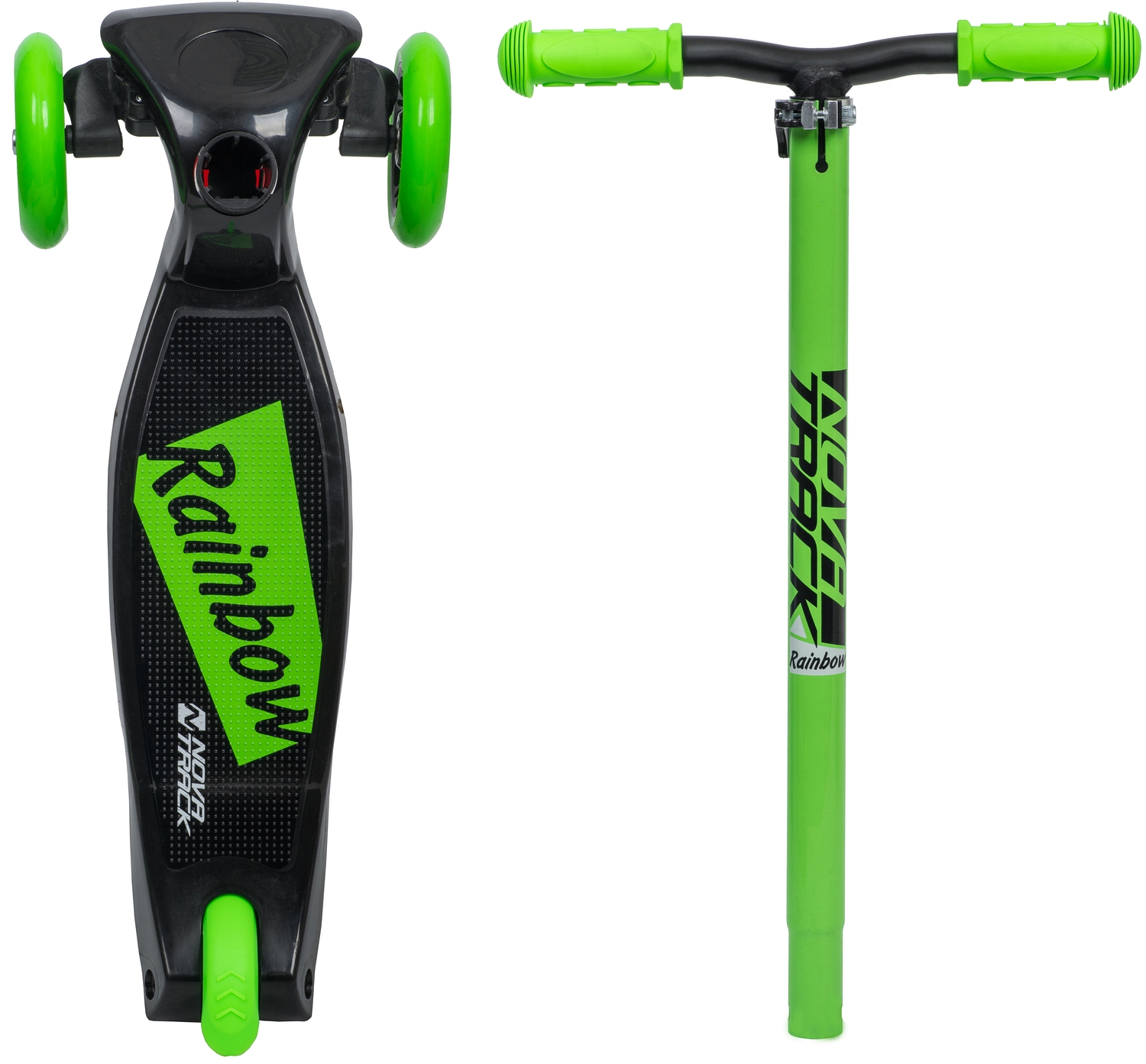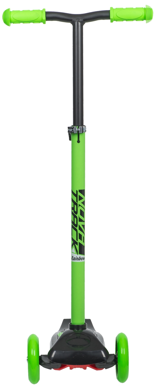 Самокат-кикборд Novatrack RainBow - это яркий детский самокат с износостойкими полиуретановыми колесами. Два колеса спереди и специальный поворотный механизм руля делают этот самокат очень устойчивым и безопасным, позволяя одинаково уверенно чувствовать себя ездокам с разным уровнем подготовки. Руль имеет регулировку по высоте, так что вам не придется через год покупать новый самокат.