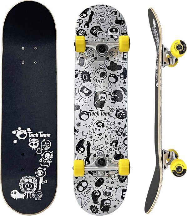 Tech Team Aliens Doodles – стильный и динамичный скейтборд с оригинальным чёрно-белым дизайном в стиле дудл-арта. Его необычный узор привлекает внимание и подчёркивает индивидуальность владельца, а качественные комплектующие делают модель универсальной для катания по городу и выполнения трюков. Лёгкая, но прочная конструкция из русского клёна, надёжная алюминиевая подвеска и сбалансированные характеристики колёс создают комфортные условия для райдеров любого уровня.