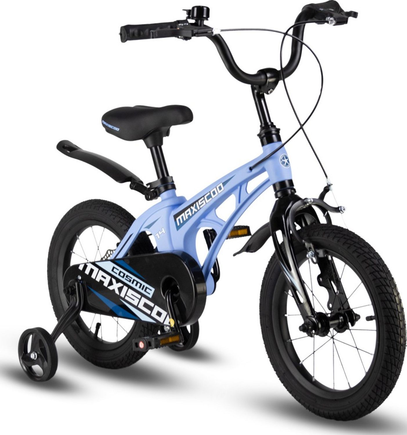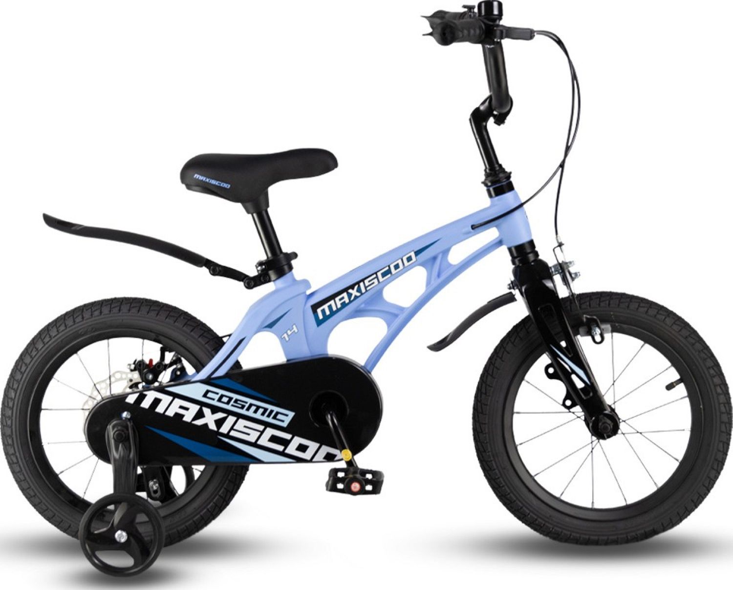 В комплекте с велосипедом идут боковые колеса, крылья и звонок, а также полная защита цепи. Это обеспечивает дополнительную безопасность и комфорт при езде, позволяя ребенку наслаждаться своими приключениями на велосипеде Maxiscoo COSMIC Стандарт 14" (2024).