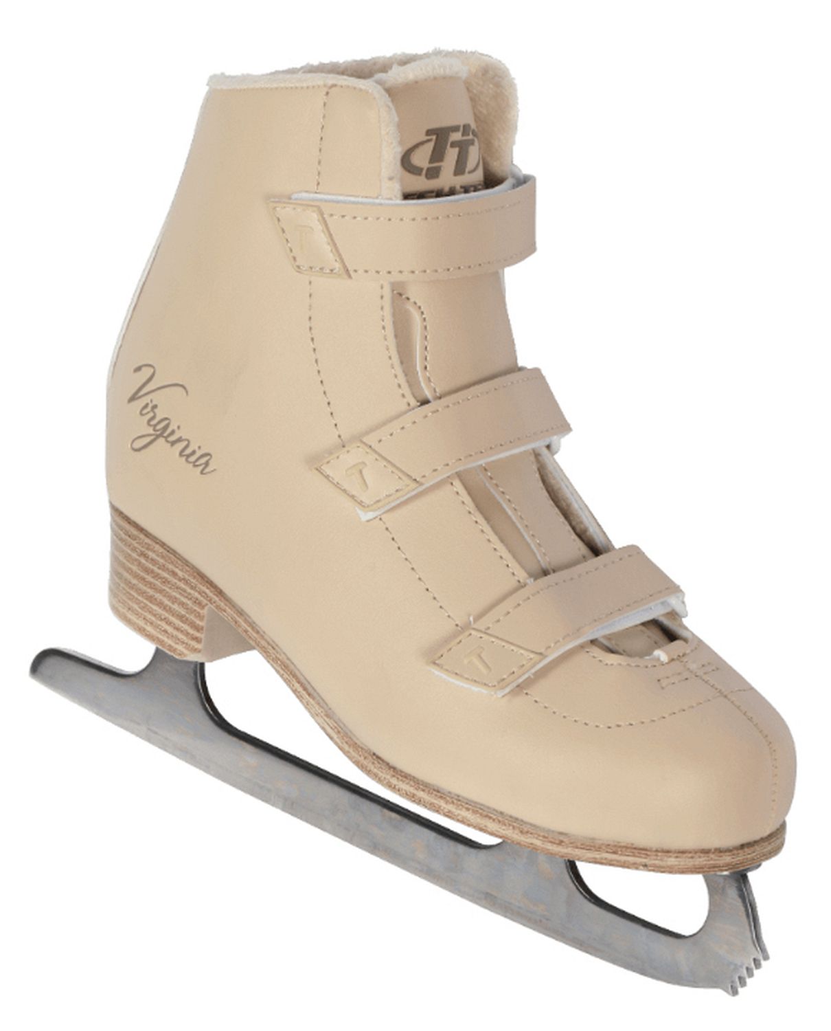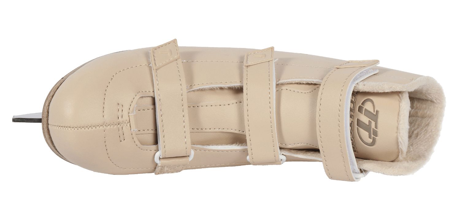 Практичные женские фигурные коньки с ботинком из искусственной кожи с застежками на липучках и подкладкой из короткого синтетического меха.