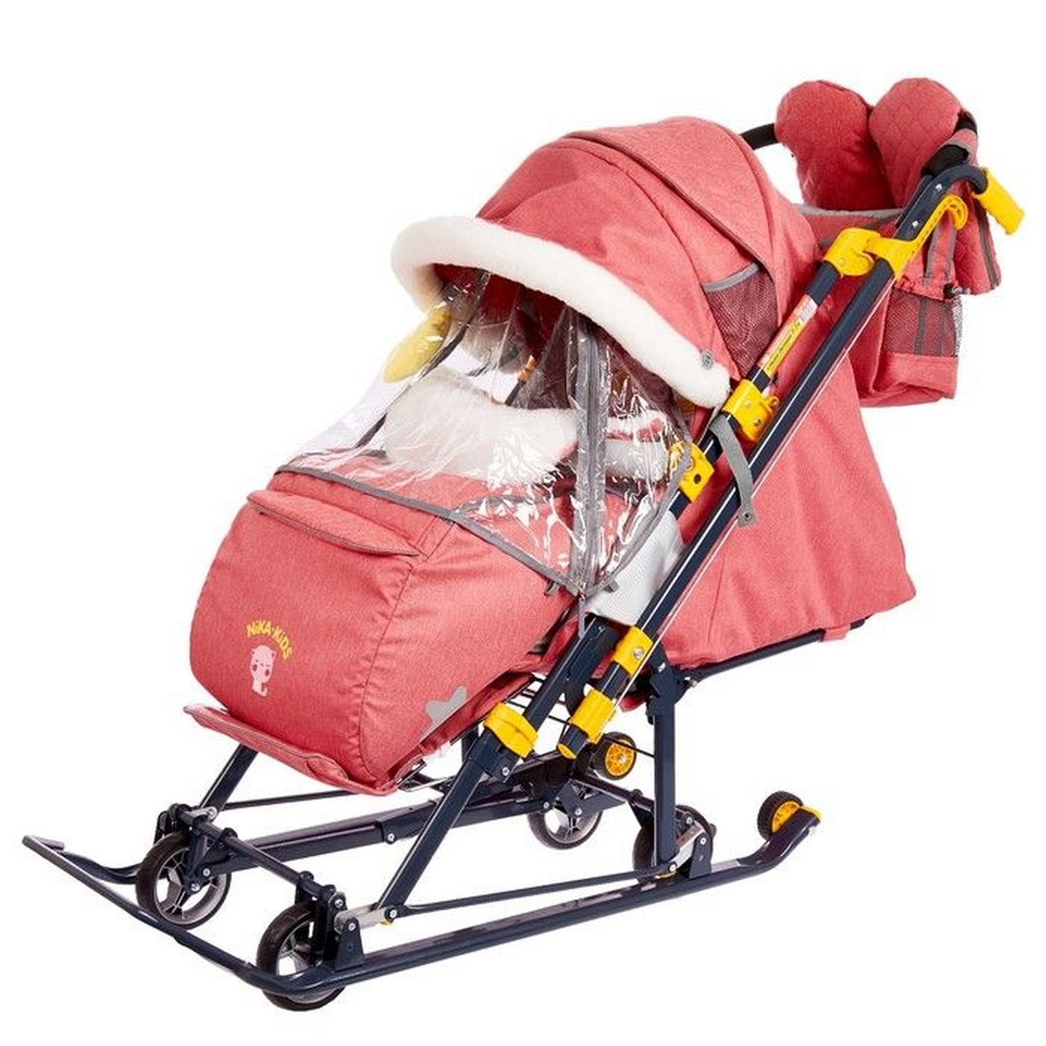 Удобные и практичные санки-коляска - незаменимый помощник мамы и малыша. Теплый чехол на ножки и складной капюшон надежно защитят от ветра, снега и мороза. В таких санках ребенку будет тепло и уютно. Санки удобны тем, что, помимо классических полозьев для езды по снегу, имеются выдвижные колеса, которыми можно воспользоваться на асфальтированных участках дороги, а также для посещения магазина. Такие санки очень удобны в эксплуатации. Тканевый чехол с утеплителем обладает прекрасными гигроскопическими свойствами. Спинка регулируется в трех положениях, так что малыш сможет с комфортом поспать во время прогулки. Также имеется муфта для мамы, чтобы возить санки было не холодно. Санки оснащены и сумкой для перевозки различных вещей малыша. Она крепится на ручку.