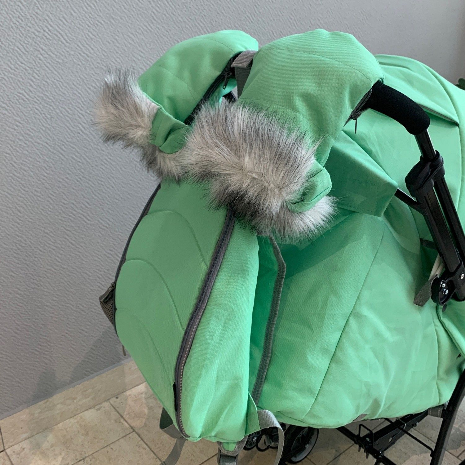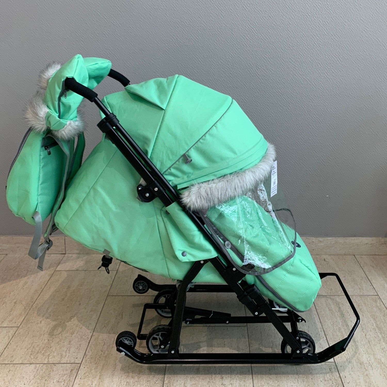 Перекидная ручка позволяет выбрать направление движения, а складной трёхсекционный козырёк с дискретным перемещением закрывает малыша от ветра и осадков. Смотровое окошко даёт возможность наблюдать за ребёнком, не отвлекаясь от управления. В комплекте – меховые рукавички и стильный рюкзак, который можно использовать отдельно.
